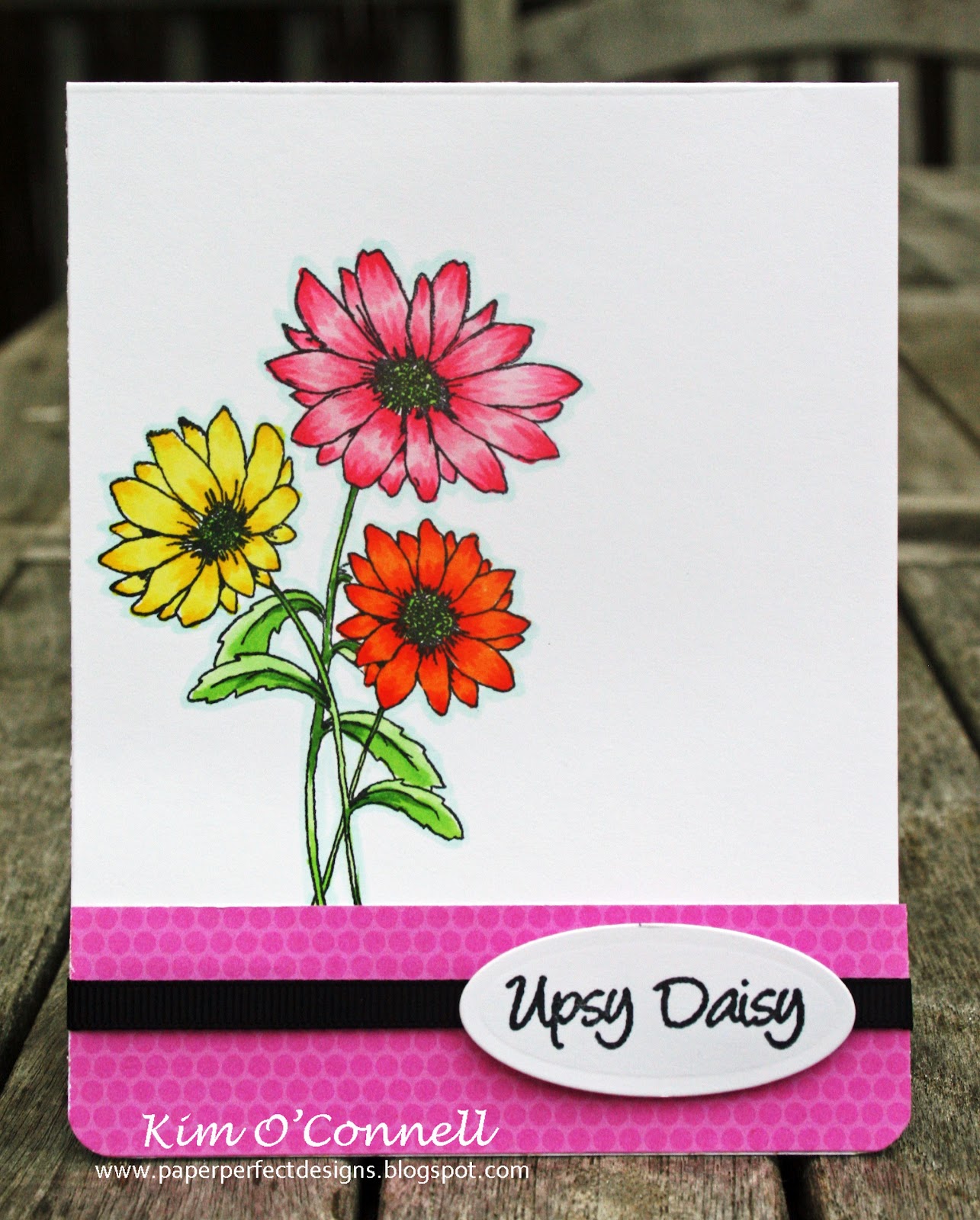I used the FTL180 layout for this card. I chose to use the beautiful Paper and Such Daisies stamp set and colored them up in my favorite gerber daisy colors. I colored them with copics and then added a strip of DSP from the Doodlebug Designs Sugar & Spice 6x6 paper pad. I added black grosgrain ribbon and the sentiment.....and stepped AWAY from the crafting table.
