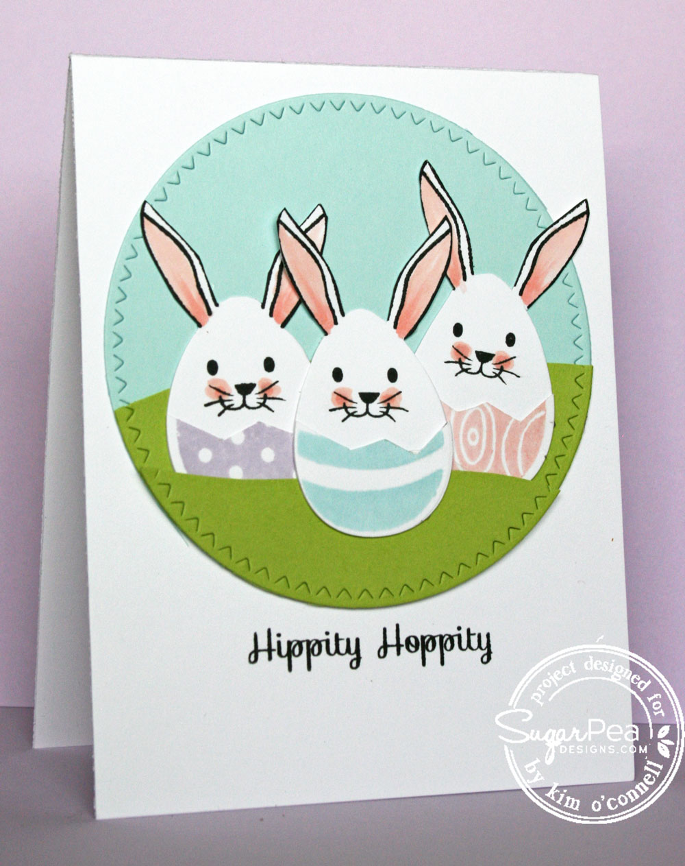 I die cut 6 eggs using the SugarCuts-Eggalicious and stamped 3 with the patterns from the Egg-a-licious stamp set. I thencut thepatterned agges and layered them over the white egg.